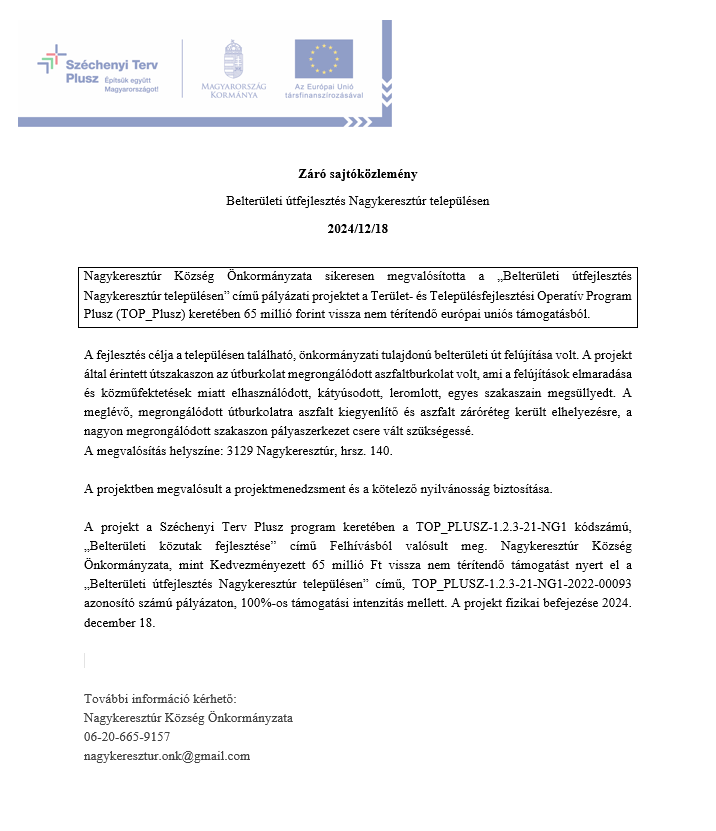 Belterületi útfejlesztés Nagykeresztúr településen